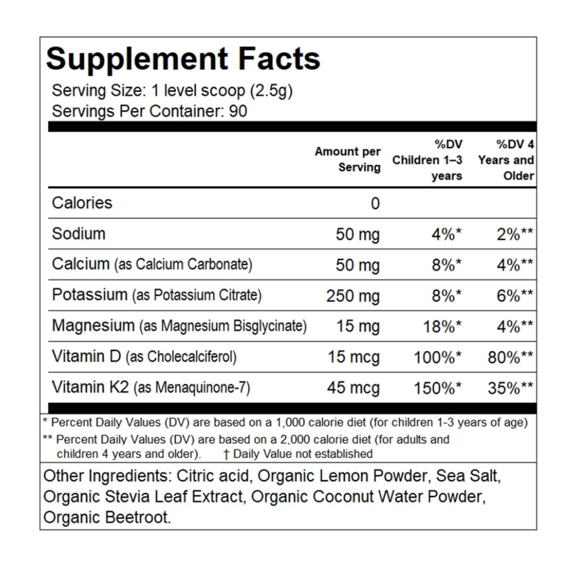 ✔ Includes a child-appropriate dose of Potassium, as well as Calcium & Magnesium